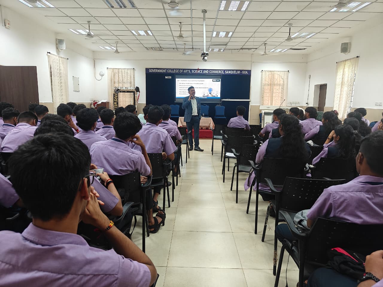 The interactive Q&A that followed witnessed enthusiastic participation, with students seeking guidance on opportunities in digital business, innovation and start-up ecosystems. The event was well-coordinated by Ms. Ishwari Kamat and Ms. Pritam Naik, under the guidance of Mr. Prashant Bhonsle, HOD of Commerce, and Prof. Namdev Gawas, Principal of the College.